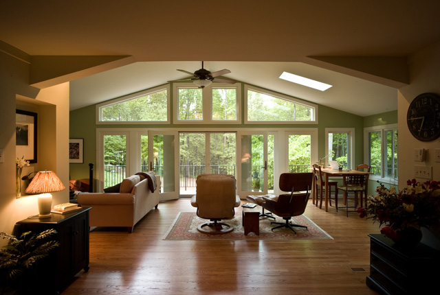 We opened up the house, resulting in 500 additional square feet and lots of natural light. We removed an old deck to make way for a spacious sunroom that transitions into the existing home.
